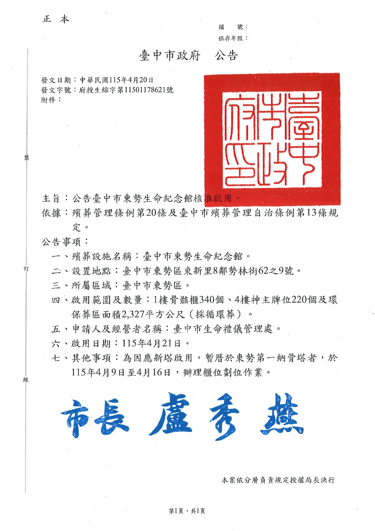 公告臺中市東勢生命紀念館核准啟用。